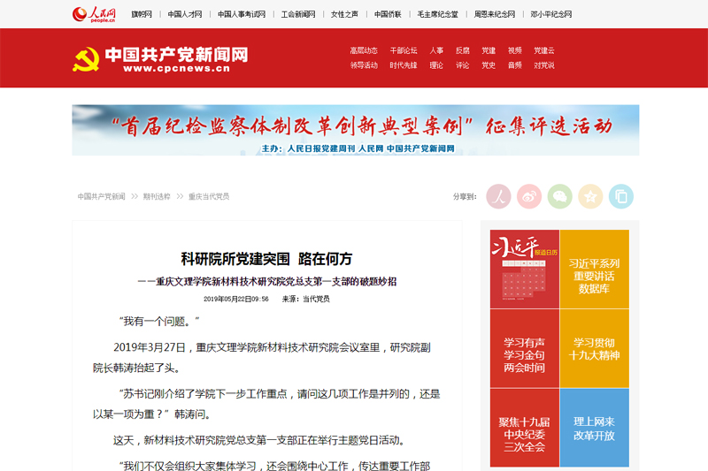 今年初,《当代党员》记者采访了beat365官网新材料技术研究院党总支第一支部,并在《当代党员》2019年第10期,以《科研院所党建突围 路在何方?——beat365唯一官方网站新材料技术研究院党总支第一支部的破题妙招》为题对支部经验做法进行了报道。5月22日,人民网/中国共产党新闻网对报道进行了转载。
