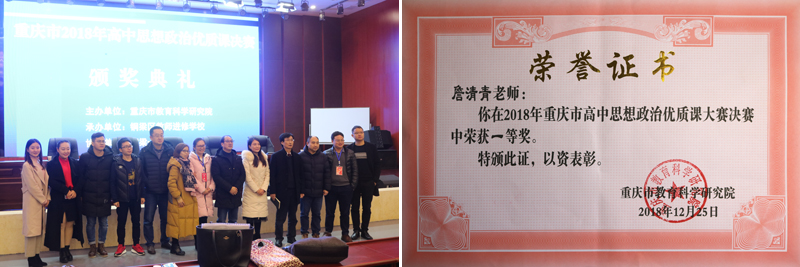 2012级学员詹清青,就职于荣昌区永荣中学,从事高中政治教学工作,在教学方面十分认真、不断坚持创新,多次获得市级、区级各种奖励,深受学校领导、家长和学生的喜爱。在重庆市2018年高中思想政治优质课决赛中,她以绝对优势在众多选手中脱颖而出,获得高中组一等奖第一名,突破了荣昌区高中思想政治学科多年未拿一等奖的空白。