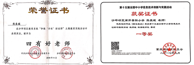 目前在沙坪坝区南开景阳小学工作的2012级学员熊袁媛,坚持全面发展,在教学比赛、论文撰写、书法比赛等多个领域数次获奖,被评为沙坪坝区“四有好老师”。在“第十五届全国中小学信息技术创新与实践活动”中,获得重庆赛区微课比赛一等奖。