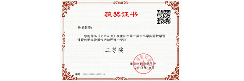 在校期间多次在重庆市和全国获奖的2014级学员杨敏,目前为永川区兴龙湖中学物理教师,一直兢兢业业,教学成绩名列前茅,去年代表永川区参加“重庆市中小学实验教学说课比赛”获得二等奖。