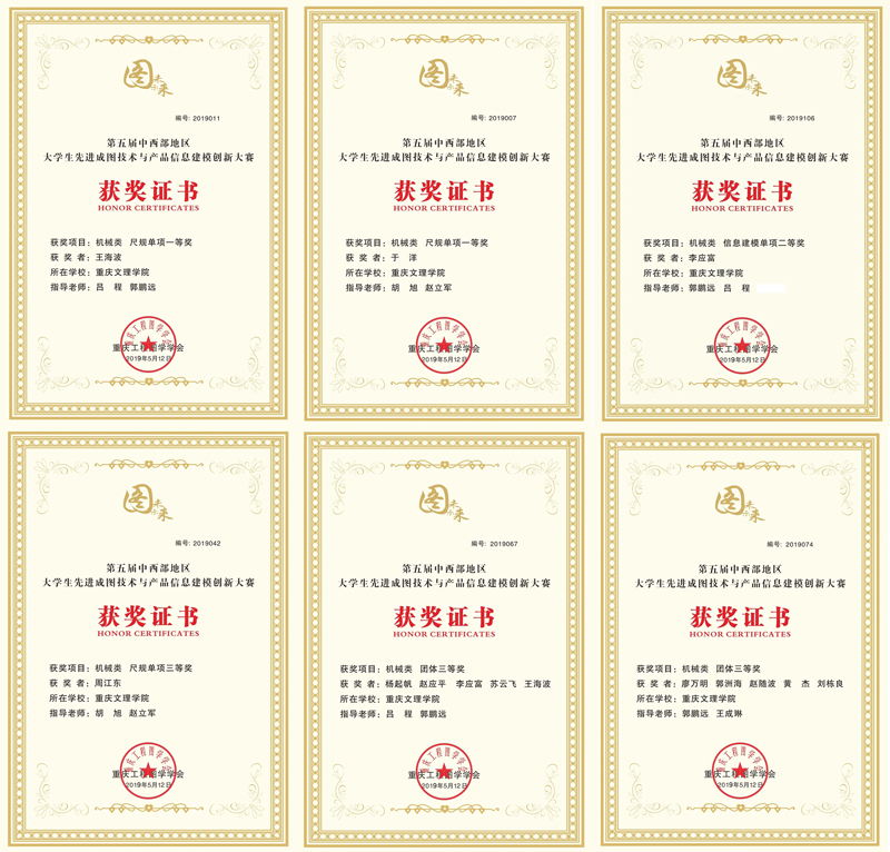 王海波、于洋(2018级机械电子工程[对口])分别获得机械类尺规绘图单项一等奖;李应富获得机械类建模单项二等奖,黄杰、赵随波、赵应平分别获得机械类建模单项三等奖;廖万明、刘栋良、赵应平、李应富、周江东(2018级机械电子工程[对口])分别获得机械类尺规绘图单项三等奖。吕程、王成琳、郭鹏远分别荣获优秀指导教师称号。