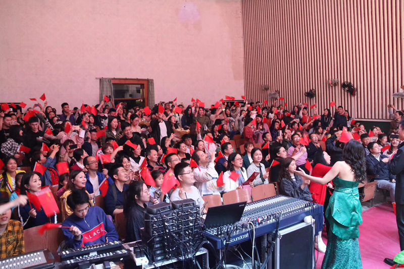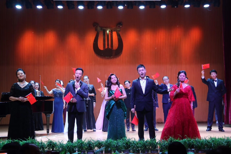 音乐会结束前,全体参演教师以音乐快闪的方式与全场观众深情同唱《我和我的祖国》,台上台下歌声嘹亮,演员观众红旗摇曳,真切表达了对祖国的赤子之心,展现了团结奋进的精神风貌。