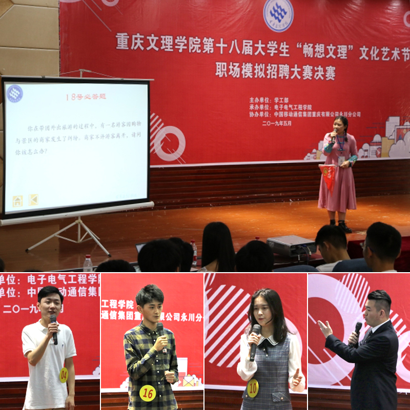 5月17日,由学工部主办、电子电气工程学院承办的第十八届大学生“畅想文理”文化艺术节之模拟职场招聘大赛决赛在博文馆101举行。本届大赛以“‘职’面未来,勇往‘职’前”为主题,分为初赛、复赛、决赛三个赛程。最终旅游学院左敏、林学与生命科学学院马雨洋获得一等奖,文化与传媒学院易芳、林学与生命科学学院饶志清、音乐学院周博获得二等奖,新材料技术研究院李璐瑶、材料与化工学院刘媛颖、经济与管理学院陈钇潼、数学与财经学院吴灿、美术与设计学院敬鑫源获得三等奖。