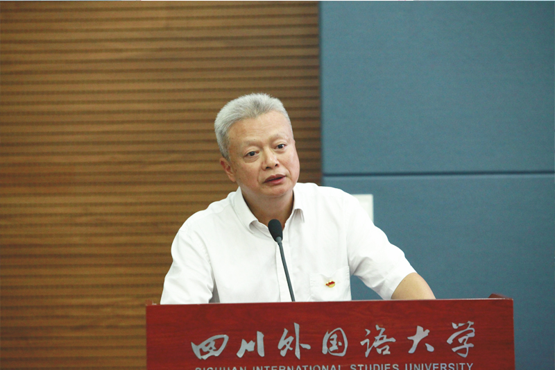 四川外国语大学党委书记邹渝主持报告会,四川外国语大学教师代表100余人出席报告会。