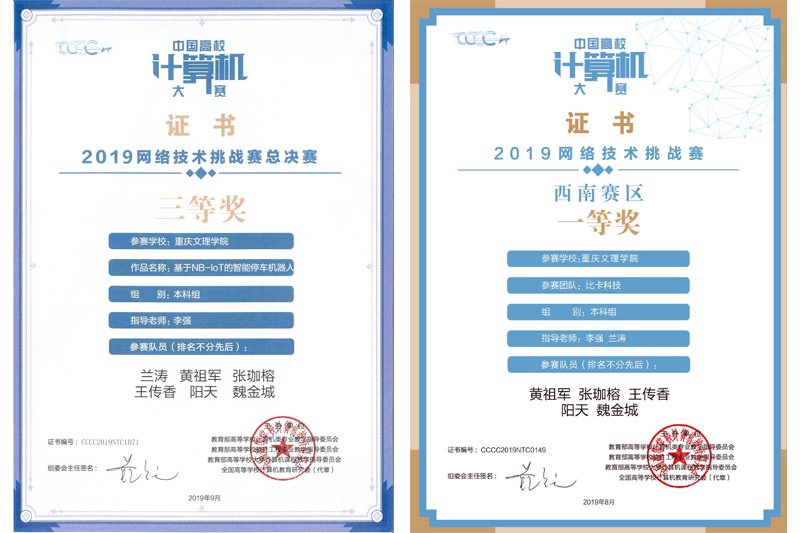 beat365官网人工智能学院学生兰涛、黄祖军、张珈榕,电子信息与电气工程学院学生王传香、魏金城,美术与设计学院学生阳天在专业教师李强的指导下,作品《基于NB-IoT的智能停车机器人》于8月选拔赛获得西南赛区本科组一等奖,并进入全国总决赛。经过9月15日全国总决赛的作品答辩、评委评判,beat365官网作品最终获得全国三等奖。
