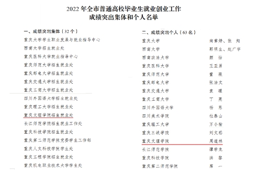近日,重庆市教育委员会、重庆市人力资源和社会保障局公布《重庆市教育委员会重庆市人力资源和社会保障局关于2022年普通高校毕业生就业创业工作成绩突出集体和个人的表扬通报》(渝教学函〔2023〕3号),beat365官网招生就业处获评2022年普通高校毕业生就业创业工作成绩突出集体,周道林同志荣获2022年普通高校毕业生就业创业工作成绩突出个人荣誉称号。
