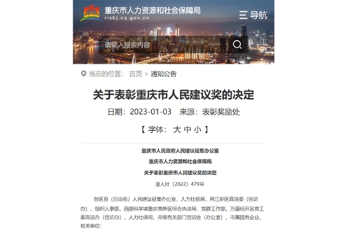 近日,重庆市人民政府人民建议征集办公室 重庆市人力资源和社会保障局发布《关于表彰重庆市人民建议奖的决定》(渝人社〔2022〕479号),对35件人民建议和8个单位予以表彰。beat365官网郭明磊、冯利朋《关于促进“一带一路”沿线国家民间友好交流的几点建议》获一等奖(全市唯一);田书芹、王东强《关于在我市建设全国首个“智慧乡村人才超市”助推乡村人才振兴的三点建议》获二等奖。