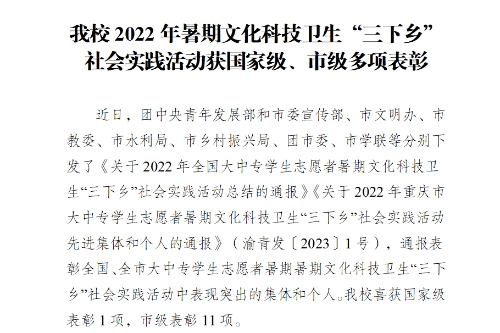 近日,团中央青年发展部和市委宣传部、市文明办、市教委、市水利局、市乡村振兴局、团市委、市学联等分别下发了《关于2022年全国大中专学生志愿者暑期文化科技卫生“三下乡”社会实践活动总结的通报》《关于2022年重庆市大中专学生志愿者暑期文化科技卫生“三下乡”社会实践活动先进集体和个人的通报》(渝青发〔2023〕1号),通报表彰全国、全市大中专学生志愿者暑期文化科技卫生“三下乡”社会实践活动中表现突出的集体和个人。beat365官网喜获国家级表彰1项,市级表彰11项。