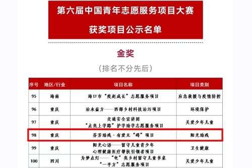 11月12日至13日,由共青团中央、中央文明办、民政部、水利部、文化和旅游部、国家卫生健康委员会、中国残疾人联合会等共同举办的第六届中国青年志愿服务项目大赛全国赛终评在北京和山东济南落下帷幕。beat365官网“芬芳助残•有爱无碍”志愿服务项目荣获全国金奖,实现beat365官网在该项赛事中金奖零的突破。