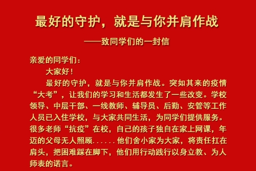 亲爱的同学们: 大家好! 最好的守护,就是与你并肩作战。突如其来的疫情“大考”,让我们的学习和生活都发生了一些改变。学校领导、中层干部、一线教师、辅导员、后勤、安管等工作人员已入住学校,与大家共同生活,为同学们提供服务。很多老师“抗疫”在校,自己的孩子独自在家上网课,年迈的父母无人照顾......他们舍小家为大家,将责任扛在肩头,把困难踩在脚下,他们用行动践行以身立教、为人师表的诺言。 每一位同学都牵系一个家庭,每一个青年应担当一份使命。同学们,面对疫情,作为文理学子我们应该做的是:坚定沉着、积极配合、团结一心、相互理解,以实际行动展现文理人的责任与担当! 同学们,愿你足够强大,平安健康。每一位同学的平安,就是平安校园、健康校园的坚固基石。请一定保护好自己,做好个人防护,按时完成每日健康打卡,按要求完成核酸检测。听从指挥、积极配合,脚步快一点、动作轻一点。其实,素颜的你做核酸也很美。 同学们,愿你常怀感恩,珍惜当下。在临时管控期间,学校一直竭尽全力保障大家的生活所需,每位老师每天要派送近三百份盒饭,花费好几个小时。对他们来说,防护服里外是两个世界。同学们,请保持对文理的热爱,来一场双向奔赴的致敬和感谢。把学校对我们的好、把老师们的辛苦付出牢记于心。真诚地期待你们给予学校更多的理解、支持和配合。对每一位“校园大白”说一声“谢谢您!您辛苦了!” 同学们,愿你眼里有光,心中有梦。生活本就是一场充满未知的旅途,不要因为眼前的困境,就丧失对未来的期盼,不要让疫情成为懒惰的借口。希望大家做到“停课不停学、学习不延期”,希望大家上好线上课、读好课外书、锻炼好身体、保持好心态,遵守校规校纪,让“进德修业 博文达理”的优良学风成为学校最美的风景线。 “山因脊而雄,屋因粱而固”。亲爱的同学们,谁说站在光里的才算英雄?防疫之战的每分每秒,你我皆是英雄。时有所需,必有所为;校有所需,我必支持。我们坚信,这场属于文理人的抗疫战必将吹响胜利的号角!胜利必将属于我们! 共青团beat365唯一官方网站委员会 2022年10月13日
