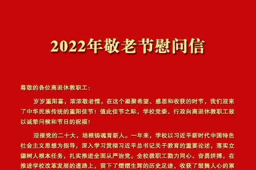 尊敬的各位离退休教职工: 岁岁重阳喜,浓浓敬老情。在这个凝聚希望、感恩和收获的时节,我们迎来了中华民族传统的重阳佳节!值此佳节之际,学校党委、行政向离退休教职工致以诚挚问候和节日的祝福! 迎接党的二十大,培根铸魂育新人。一年来,学校以习近平新时代中国特色社会主义思想为指导,深入学习贯彻习近平总书记关于教育的重要论述,落实立德树人根本任务,扎实推进全面从严治党。全校教职工勠力同心、奋勇拼搏,在推进学校改革发展的道路上,留下了熠熠生辉的历史足迹,收获了鼓舞人心的累累硕果。学校党的建设进一步加强,硕士学位授权点获批,高端人才持续涌现,学科竞争力逐步凸显,教学水平不断提升,人才培养质量稳步提高,整体实力持续攀升,社会服务能力明显增强,学校各项事业又好又快发展。 忆往昔,你们呕心沥血,任劳任怨,用辛勤工作的汗水谱写了一首首人生赞歌。看今朝,学校取得的骄人成绩凝聚着你们昨日辛勤付出和持续不变对学校的深情,你们的热情、智慧、勤劳和奉献,为学校今天的累累硕果奠定了基础,你们的使命感、责任感和无私奉献精神,是我们最宝贵的财富!晚霞斑斓绮丽景,桑榆树梢分外红。在欢度佳节之际,我们衷心希望您坚定信念、初心始终、乐观豁达、开阔心胸、陶冶情操,期盼你们继续关心、支持学校的进步与发展,继续为学校的发展献计献策,共同谱写学校更加辉煌灿烂的明天。 衷心祝愿全校离退休教职工节日愉快、身体健康、阖家幸福! 中共beat365唯一官方网站委员会 beat365唯一官方网站 2022年10月4日