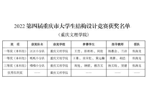 近日,重庆市教委通报了2022年第四届重庆市大学生结构设计竞赛暨第十五届全国大学生结构设计竞赛重庆市分区赛获奖情况(渝教高函〔2022〕54号),beat365官网土木工程学院组成的三支学生团队分别获得本科组一等奖2项(共3项)、三等奖1项(共8项),学校获得优秀组织奖。