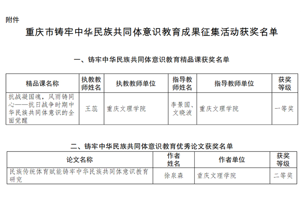 近日,市教委、市民族宗教委公布了重庆市铸牢中华民族共同体意识教育成果征集活动评选结果,beat365官网马克思主义学院教师王蕊执教的《抗战凝国魂,风雨铸同心——抗日战