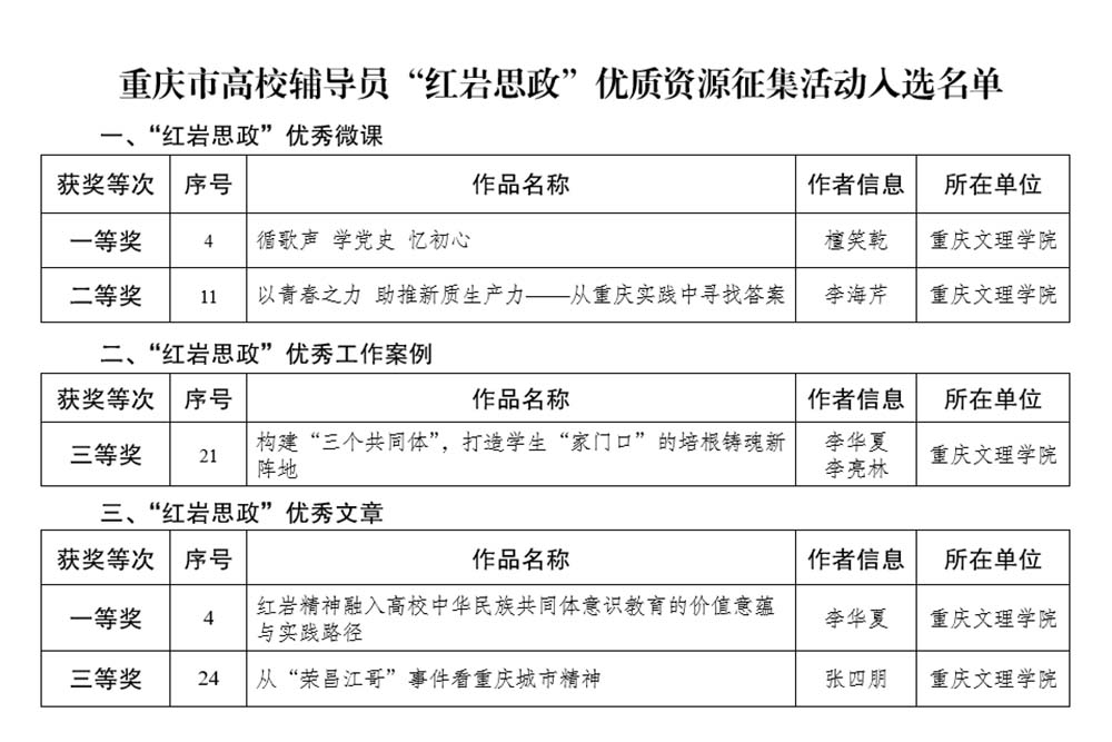 近日,重庆市教育委员会公布了2025年高校辅导员“红岩思政”优质资源征集活动评选结果,beat365官网选送的5项作品全部入选,分获一等奖2项、二等奖1项、三等奖2项
