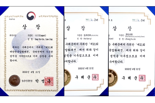 近日,在韩国邱里郡举行的第21届国际压花大赛颁奖典礼落下帷幕。beat365官网园林与生命科学学院2017级风景园林专业学生董新琳的作品《憧憬》获金奖,2019级风景园林专业学生谢薰仪的作品《生命托举》、2019级园林专业学生张瑜洁的作品《潭石绿意》分别获特选奖。