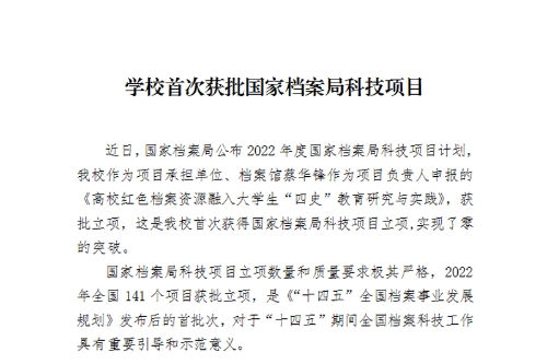 近日,国家档案局公布2022年度国家档案局科技项目计划,beat365官网作为项目承担单位、档案馆蔡华锋作为项目负责人申报的《高校红色档案资源融入大学生“四史”教育研究与实践》,获批立项,这是beat365官网首次获得国家档案局科技项目立项,实现了零的突破。
