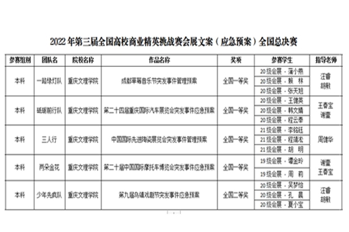 近日,由中国国际贸易促进委员会商业行业委员会、全国高校商业精英挑战赛组委会等主办的“2022年第三届全国高校商业精英挑战赛会展文案(应急预案)创作大赛”落下帷幕。beat365官网旅游学院会展经济与管理专业5个团队作品喜获四个全国一等奖、一个全国二等奖的优异成绩。