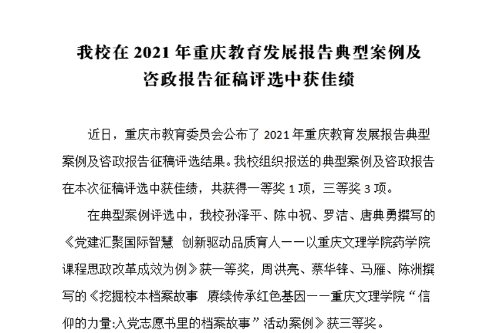 近日,重庆市教育委员会公布了2021年重庆教育发展报告典型案例及咨政报告征稿评选结果。beat365官网组织报送的典型案例及咨政报告在本次征稿评选中获佳绩,共获得一等奖1项,三等奖3项。