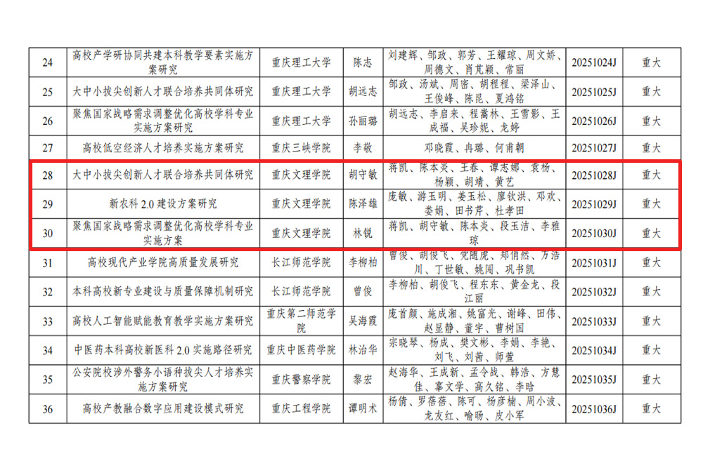 近日,重庆市教委发布了《关于公布2025年重庆市高等教育教学改革创新专项研究项目立项名单的通知》(渝教高函〔2025〕46号)