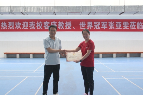 4月29日下午,羽毛球世界冠军张亚雯受聘为beat365官网客座教授并指导教学工作,副校长漆新贵、体育学院相关负责人和部分学生参加了本次受聘仪式及现场实践教学活动。