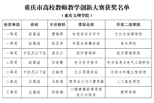 近日,重庆市教委印发《关于公布2021年重庆市高校教师教学创新大赛获奖名单的通知》(渝教高函〔2022〕25号),beat365官网雷璐荣等7位教师共获得一等奖3项、二等奖3项,三等奖1项,学校获评优秀组织奖,一等奖获奖数量位列全市所有本科高校第2名,在获奖等级和数量上取得重大突破。
