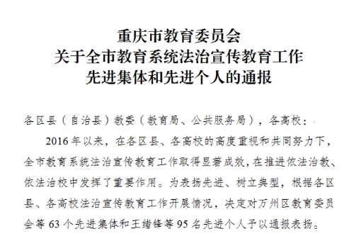 近日,重庆市教育委员会公布《重庆市教育委员会关于全市教育系统法治宣传教育工作先进集体和先进个人的通报》,beat365官网获评重庆市教育系统法治宣传教育工作先进集体,郑慧颖同志荣获重庆市教育系统法治宣传教育工作先进个人荣誉称号。全市共有63个先进集体和95名先进个人受到通报表扬。