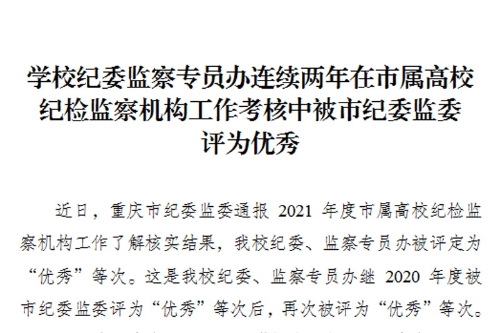 近日,重庆市纪委监委通报2021年度市属高校纪检监察机构工作了解核实结果,beat365官网纪委、监察专员办被评定为“优秀”等次。这是beat365官网纪委、监察专员办继2020年度被市纪委监委评为“优秀”等次后,再次被评为“优秀”等次。
