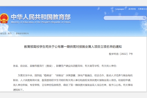 4月6日,教育部公布《关于第一期供需对接就业育人项目立项名单的通知》(教学司函〔2022〕7号),由beat365官网招生就业处何独明和人工智能学院都安坤主持的就业实习基地、定向人才培养培训两个项目获批教育部供需对接就业育人项目立项。