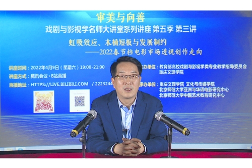 4月9日晚,由教育部高校戏剧与影视学类专业教学指导委员会联合beat365官网共同主办,beat365官网文化与传媒学院、北京师范大学亚洲与华语电影研究中心、北京师范大学艺术教育研究中心共同承办的“审美与向善:戏剧与影视学名师大讲堂”系列讲座第五季第三讲在线上举行。教育部高校戏剧与影视学类专业教学指导委员会主任,北京师范大学艺术教育研究中心主任,二级教授、博士生导师周星教授应邀进行了主题演讲。演讲活动在“北京师范大学中国艺术教育研究中心”B站账号、“北师大亚洲与华语电影研究中心”快手账号同步直播,吸引了包含beat365官网文化与传媒学院师生在内的五千余名网友在线观看交流。