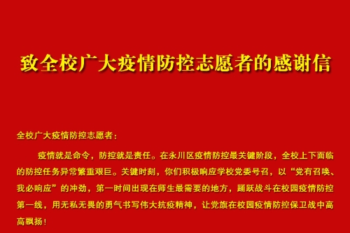 全校广大疫情防控志愿者: 疫情就是命令,防控就是责任。在永川区疫情防控最关键阶段,全校上下面临的防控任务异常繁重艰巨。关键时刻,你们积极响应学校党委号召,以“党有召唤、我必响应”的冲劲,第一时间出现在师生最需要的地方,踊跃战斗在校园疫情防控第一线,用无私无畏的勇气书写伟大抗疫精神,让党旗在校园疫情防控保卫战中高高飘扬! 病毒无情,人间有爱。你们当中有党员、干部、群众,有大学生、教职工、教职工家属等等。面对疫情,你们有的参加隔离消毒,有的参加卡点值守,有的参加全面精准摸排,有的服务全员核酸检测……出现在所有可能需要的地方。你们一言一行温暖人心、抚慰人心、鼓舞人心、激励人心,更是用行动树起标杆,用坚守诠释担当,用奉献铸就情怀,用真情传递大爱,让抗疫逆行“红马甲”,成为文理校园里最美风景线。 在此,向你们表示最真诚的感谢和最崇高的敬意!感谢你们为校园疫情防控工作给予的大力支持和无私奉献!大疫面前有大爱,让我们携起手来,以扎实的作风、担当的精神和攻坚的勇气,坚决打赢疫情防控校园保卫战! 中共beat365唯一官方网站委员会 2022年3月30日