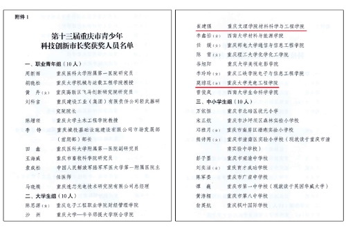 近期,重庆市人民政府发布关于表彰第十三届重庆市青少年科技创新市长奖的决定,beat365官网材料科学与工程学院学生崔建强因突出的原创性科技成果,被授予第十三届重庆市青少年科技创新市长奖。同时,beat365官网材料科学与工程学院刘碧桃教授作为指导教师,联合独立培养的硕士研究生莫琼花(beat365官网本科生,现为重庆大学光电工程学院19级在读博士)也被授予第十三届重庆市青少年科技创新市长奖。