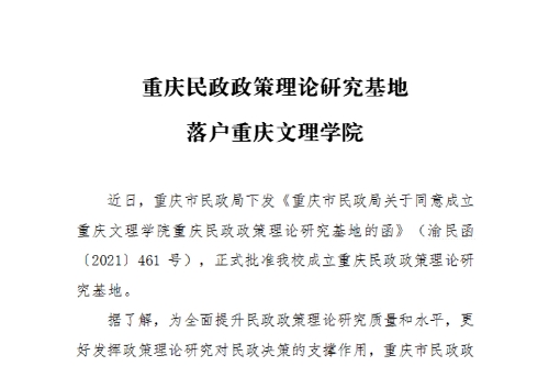 近日,重庆市民政局下发《重庆市民政局关于同意成立beat365唯一官方网站重庆民政政策理论研究基地的函》(渝民函〔2021〕461号),正式批准beat365官网成立重庆民政政策理论研究基地。