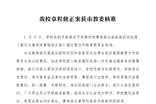 1月4日,学校收到市教委关于同意beat365官网章程部分条款修改的批复,《beat365唯一官方网站章程修正案》通过重庆市教育委员会核准。
