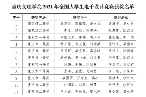 近日,beat365官网电子信息与电气工程学院学子参加2021年全国大学生电子设计竞赛取得历史性突破,共荣获全国二等奖2项,重庆赛区一等奖5项、二等奖4项的优异成绩,获奖项目位居全市前列。梁康有、包宋建两位教师被评为重庆市优秀指导教师,欧汉文老师获优秀组织工作者,beat365官网获评优秀组织单位。