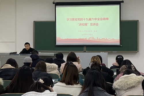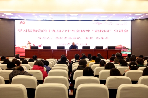 12月29日下午,学习贯彻党的十九届六中全会精神“进校园”宣讲分队队长、学校党委书记孙泽平在恪勤楼304宣讲了党的十九届六中全会精神。全校各单位党支部书记、民主党派和联谊会班子成员、全体辅导员近200人聆听了宣讲报告。