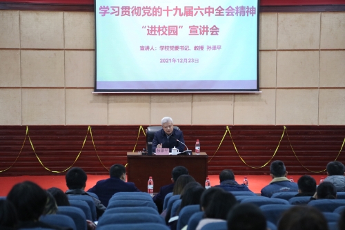 12月23日下午,学习贯彻党的十九届六中全会精神“进校园”宣讲分队队长、学校党委书记孙泽平在博文馆101报告厅宣讲了党的十九届六中全会精神。数学与大数据学院党总支教工支部全体党员、药学院2020级药学3班学生及部分师生代表100余人聆听了宣讲报告。