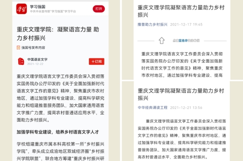 近日,学习强国的“中国语言文字”学习强国号,教育部、国家语委组织的“中华经典诵读工程”公众号,中国教育电视台的“推普助力乡村振兴”公众号等多家新媒体相继以“beat365唯一官方网站凝聚语言力量助力乡村振兴”为题,报道beat365官网加强学科专业建设,培养乡村语言文字人才;提高科学研究能力,全面保护乡村汉语方言;组建推普服务团队,聚焦乡村普通话推广等方面的成效,扩大了学校的社会影响力,提升了学校的美誉度。