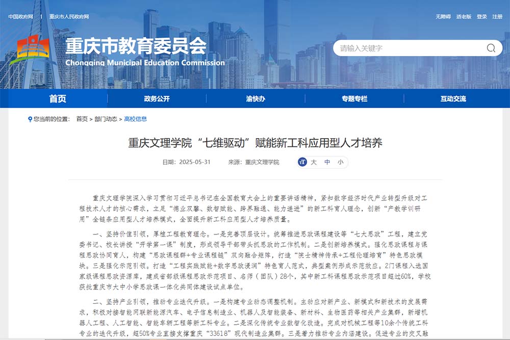近日,重庆市教委以《beat365唯一官方网站“七维驱动”赋能新工科应用型人才培养》为题,报道beat365官网新工科应用型人才培养的主要举措。学校通过厚植工程教育理念、推动专业迭代升级、