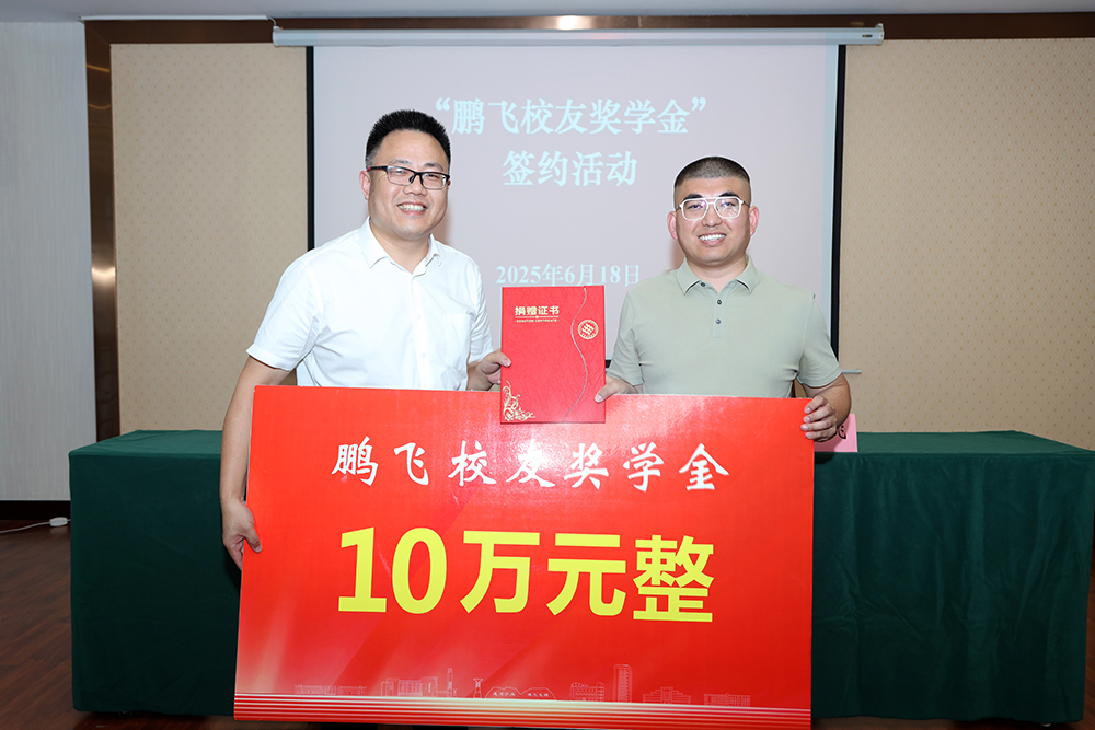 6月18日下午,学校在恪勤楼422会议室举行“鹏飞校友奖学金”捐赠仪式。副校长陈中祝,数学与人工智能学院2016届校友、北京天地行走信息科技有限公司总经
