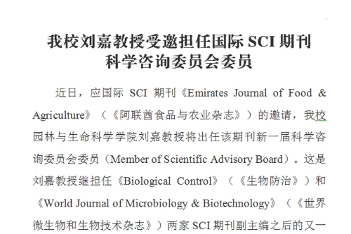 近日,应国际SCI期刊《Emirates Journal of Food & Agriculture》(《阿联酋食品与农业杂志》)的邀请,beat365官网园林与生命科学学院刘嘉教授将出任该期刊新一届科学咨询委员会委员(Member of Scientific Advisory Board)。这是刘嘉教授继担任《Biological Control》(《生物防治》)和《World Journal of Microbiology & Biotechnology》(《世界微生物和生物技术杂志》)两家SCI期刊副主编之后的又一重要国际学术任职。该项国际化合作交流将提升beat365官网在农业和食品科技领域的国际影响力,为学校建设高水平应用型大学提供有力支撑。