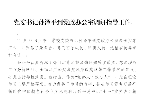 11月9日上午,学校党委书记孙泽平到党政办公室调研指导工作,并列席了处务会。部门班子成员、科岗人员、纪检委员等参加会议。