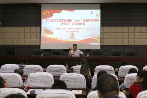 9月29日下午,学校党委副书记、校宣讲队副队长兰刚在志仁楼114会议室宣讲习近平总书记“七一”重要讲话精神,经济管理学院、体育学院师生代表100余人参加了宣讲会。宣讲会由经济管理学院党总支书记赵锋主持。