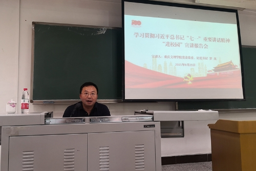 9月29日下午,学校党委常委、纪委书记、市监委驻学校监察专员罗茂在知津楼D203宣讲习近平总书记“七一”重要讲话精神。马克思主义学院和文化与传媒学院部分党员干部、教师代表、学生代表共150余人参加了宣讲会。