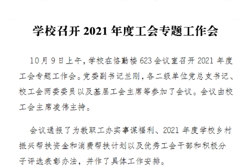 10月9日上午,学校在恪勤楼623会议室召开2021年度工会专题工作会。党委副书记兰刚,各二级单位党总支书记、校工会两委委员以及基层工会主席等参加了会议。会议由校工会主席凌伟主持。