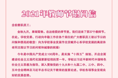 全校教职员工: 金秋九月,果硕菊香。在这收获的季节里,我们迎来了第37个教师节。在此,学校党委、行政向辛勤工作在各个岗位的广大教职员工致以节日的问候和崇高的敬意!向为学校事业发展作出贡献并心系学校发展的离退休老同志致以节日的问候和诚挚的祝福! 今年是中国共产党成立100周年,是实施“十四五”规划、开启全面建设社会主义现代化国家新征程的第一年,学校以习近平新时代中国特色社会主义思想为指导,深入贯彻党的十九大和十九届二中、三中、四中、五中全会精神及习近平总书记关于教育的重要论述,学校各项事业呈现良好的发展态势。 十三五期间,学校已建成3个国家级平台,22个市级科研平台,科研项目持续增长,累计获得国家级项目79项、市级及以上科研成果奖45项,获得授权专利800余项;同时,高质量、高水平学术论文数量大幅增加,达到1800余篇;具有自主知识产权的PDE5抗抑制剂国际一类新药获得国家药品监督管理局和美国FDA临床批文,并以3000万元成功转化;纳米银线系列专利、脱毒生姜连作技术、猕猴桃良种脱毒工厂育苗技术等一批新技术成果正在进行转化和推广应用;主办的《重庆高教研究》入选《中文核心期刊要目总览》(2020)、CSSCI扩展版来源期刊目录(2021—2022)、RCCSE中国核心学术期刊(A)(2020)、WAJCI世界学术期刊学术影响力指数统计源期刊、JST日本科学技术振兴机构数据库来源期刊。 学校坚持开放办学,与美国、俄罗斯、意大利、马来西亚等国30多所高校签订了合作协议,先后开展了师生交流、合作办学、合作科研、来华留学等项目。学校全方位改革、多角度创新、超常规发展的模式被新华社、中国青年报等媒体誉为“文理现象”,《中国教育报》头版头条专题报道了beat365官网转型发展成绩。 学校坚持人才培养聚力脱贫,获“全国脱贫攻坚先进集体”荣誉称号,是全市教育系统唯一获此殊荣的单位。为推动乡村全面振兴,组建市属本科高校第一所“乡村振兴学院”,牵头成立成渝地区双城经济圈“乡村振兴学院联盟”,联合地方筹建“重庆乡村振兴研究院”,成功获批成渝地区双城经济圈乡村振兴国家级专家服务基地。 百年树人成伟业,一颗丹心报党恩。在收获赞誉和敬重的同时,我们更要时刻牢记肩负的神圣使命和光荣职责。希望广大教职员工一如既往的发扬优良传统,以培育人才、传承文明、发展先进文化和推动社会进步为己任,自觉为人师表,模范履职尽责,在“十四五”规划开局之年,继续鼓足干劲,抢抓发展机遇,深入推进学校转型发展,为把beat365官网早日建成区域性、国际化、高水平应用型大学而努力奋斗! 祝大家教师节快乐! 中共beat365唯一官方网站委员会 beat365唯一官方网站 2020年9月9日