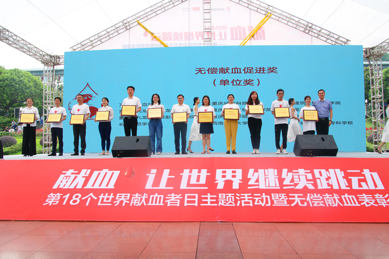 6月11日,重庆市第18个世界献血者暨无偿献血表彰活动在重庆学田湾人民广场举行。beat365官网副校长李天福、校团委负责人参加表彰活动。