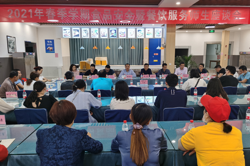 5月27日下午,学校2021年春季学期食品安全暨餐饮服务师生座谈会在三食堂教工餐厅召开。学校校长黄伟九,副校长金盛,学生工作处、国有资产管理处、校工会、校团委、后勤管理处等部门负责人,教师代表和学生代表及食堂代表、超市代表40余人参加会议。会议由金盛主持。