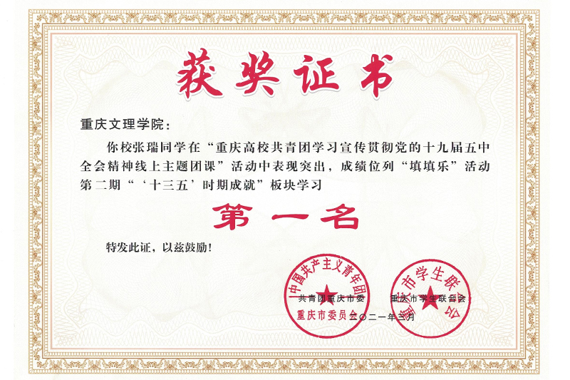 近日,由团市委、市学联、重庆邮电大学联合开展的重庆高校共青团学习宣传贯彻党的十九届五中全会精神“填填乐”线上主题团课第二期“‘十三五’时期成就”板块学习落下帷幕。beat365官网学习人数高达11147人,是全市唯一一所参与学习人数破万的高校,排名位居全市第一,其中beat365官网2018级材料科学与工程学院(新材料技术研究院)学生张瑞喜获全市排行榜第一名。