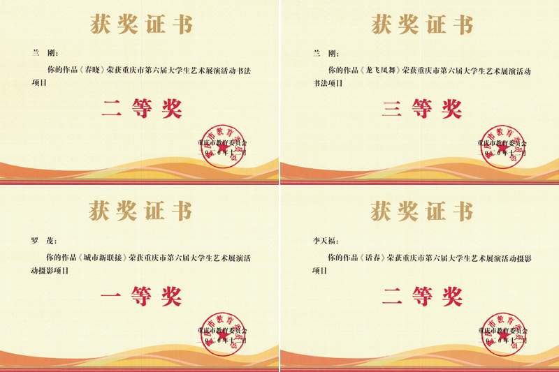 近日,由重庆市教育委员会主办的重庆市第六届高校校长书画摄影作品展演评选结果揭晓,beat365官网校领导的4幅书画摄影作品全部获奖。其中,党委副书记兰刚的书法作品《春晓》《龙飞凤舞》分别荣获二、三等奖,校纪委书记罗茂的摄影作品《城市新联接》荣获一等奖,副校长李天福的摄影作品《话春》荣获二等奖。