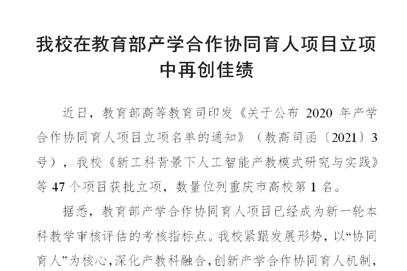 近日,教育部高等教育司印发《关于公布2020年产学合作协同育人项目立项名单的通知》(教高司函〔2021〕3号),beat365官网《新工科背景下人工智能产教模式研究与实践》等47个项目获批立项,数量位列重庆市高校第1名。